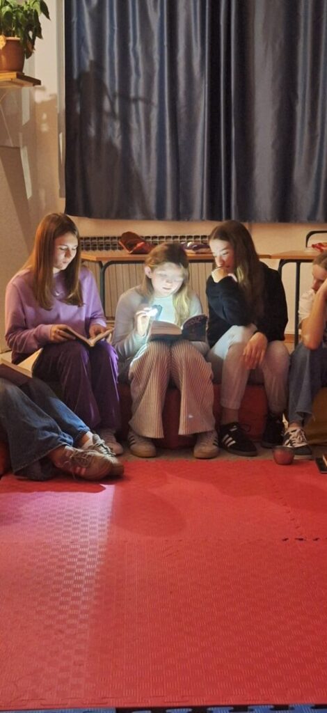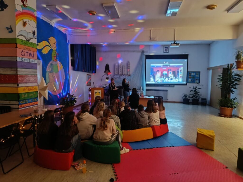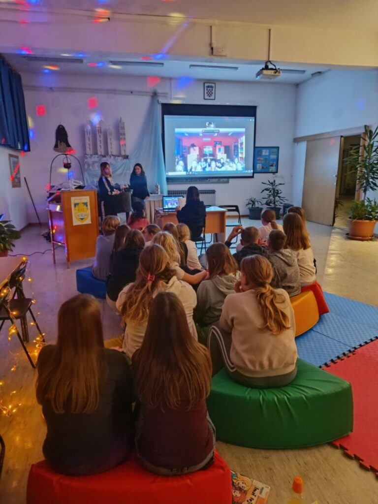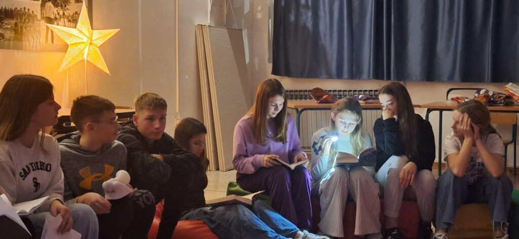 U petak 7. studenog u našoj se školi održao noćni čitateljski susret u sklopu projekta “Tulum s(l)ova”. Projekt je to u kojem sudjelujemo već treću godinu za redom, a cilj mu je aktivnostima poput javnih čitanja u lokalnoj zajednici i noćnih čitateljskih susreta razvijati naviku čitanja iz užitka među učenicima 7. i 8. razreda. Na ovogodišnjem čitateljskom susretu okupilo se 18 učenika uz učiteljice Jovanu Mijić i Petru Domaćinović, pedagoginju Francisku Mahić i knjižničarku Monu Othman. Večer je započela dogovorom pravila i igrom asocijacija pomoću Dixit karata. Zatim su učenici u polumraku, uz svjetlost džepnih svjetiljki, čitali na glas ulomke iz svojih omiljenih knjiga. Nakon čitanja imali smo videopoziv s “tulumašima” iz Osnovne škole Ante Starčevića Lepoglava kojima je našu školu predstavila učenica Melani Keko. Vrhunac večeri svakako je bila igra “Bijeg iz škole” (u stilu popularne igre Escape room) tijekom koje su učenici podijeljeni u pet timova u mračnom školskom prizemlju trebali rješavati različite zadatke, mozgalice i dešifrirati poruke na glagoljici kako bi otkrili i pronašli knjigu u kojoj se nalazio ključ za izlazak iz škole. Uz dobru atmosferu, suradnju i zajednički trud, učenici su nam još jednom potvrdili da su pravi ključ svakog uspjeha timski rad i dobro raspoloženje.